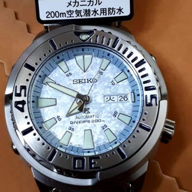 Seiko prospex baby tuna edition made in japan sbdy053 stainless steel bracelet 200m water resistance rotating bezel glittering ice frost white blue dial day and date display automatic movement caliber.