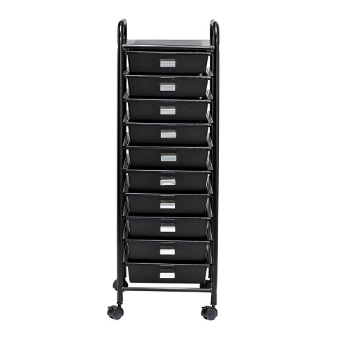 Cart includes 10 removable polypropylene drawers in black with an opaque finish and chrome drawer pull knobs.